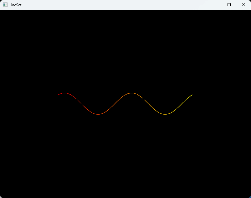 std::shared_ptr<geometry::LineSet> MakePolyline() { const double x0 = -2.0 * 3.14159; const double x1 = 2.0 * 3.14159; const double amplitude = 1.0; // 振幅 const double frequency = 1.0; // 周波数 const double phase = 1.0; // 位相 const int samples = 400; ///////////////////////////////////////////////////////// auto lineset = std::make_shared<geometry::LineSet>(); // 頂点作成 const double step = (x1 - x0) / (samples - 1); for (int i = 0; i < samples; ++i) { double x = x0 + step * i; double y = amplitude * std::sin(frequency * x + phase); lineset->points_.emplace_back(Eigen::Vector3d(x, y, 0.0)); } ///////////////////////////////////////////////////////// // 頂点インデックスの組み合わせで線分を作成 for (size_t i = 0; i < samples-1; ++i){ lineset->lines_.emplace_back( (int)i, (int)(i + 1) ); // 線分に対する色を設定 lineset->colors_.emplace_back(Eigen::Vector3d(1.0, i/float(samples), 0.0)); } return lineset; }