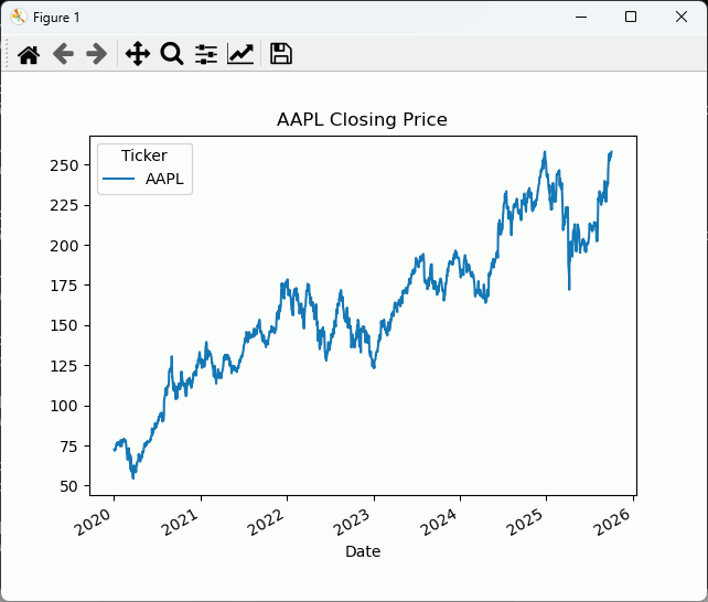 ################################### # 株価取得 ################################### import yfinance as yf df = yf.download("AAPL", start="2020-01-01", interval="1d") ################################### # 終値をグラフ表示 ################################### import matplotlib.pyplot as plt df["Close"].plot(title="AAPL Closing Price") plt.show()