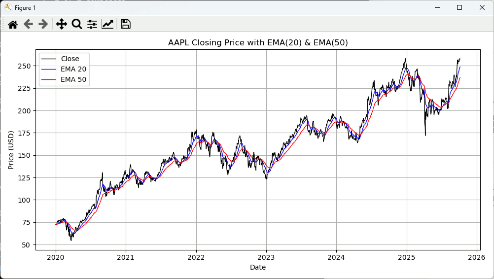 import yfinance as yf import matplotlib.pyplot as plt # データ取得 df = yf.download("AAPL", start="2020-01-01", interval="1d") # EMA(指数移動平均)を計算 df["EMA20"] = df["Close"].ewm(span=20, adjust=False).mean() # 20日EMA df["EMA50"] = df["Close"].ewm(span=50, adjust=False).mean() # 50日EMA # 終値とEMAを同じグラフに描画 plt.figure(figsize=(10, 5)) plt.plot(df.index, df["Close"], label="Close", color="black", linewidth=1) plt.plot(df.index, df["EMA20"], label="EMA 20", color="blue", linewidth=1) plt.plot(df.index, df["EMA50"], label="EMA 50", color="red", linewidth=1) plt.title("AAPL Closing Price with EMA(20) & EMA(50)") plt.xlabel("Date") plt.ylabel("Price (USD)") plt.legend() plt.grid(True) plt.tight_layout() plt.show()