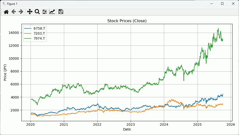 import yfinance as yf import matplotlib.pyplot as plt tickers = ["7203.T", "6758.T", "7974.T"] # 一括取得 df = yf.download(tickers, start="2020-01-01", interval="1d")["Close"] # DataFrame の確認 print(df.head()) print("==========================") # 銘柄 for symbol in df.columns: print(df[symbol]) print("==========================") # グラフ描画 plt.figure(figsize=(10, 5)) for symbol in df.columns: plt.plot( df.index, # 横軸 日付 df[symbol], # 縦軸 価格 label=symbol # 凡例のラベル ) print("==========================") plt.title("Stock Prices (Close)") plt.xlabel("Date") plt.ylabel("Price (JPY)") plt.legend() plt.grid(True) plt.tight_layout() plt.show()